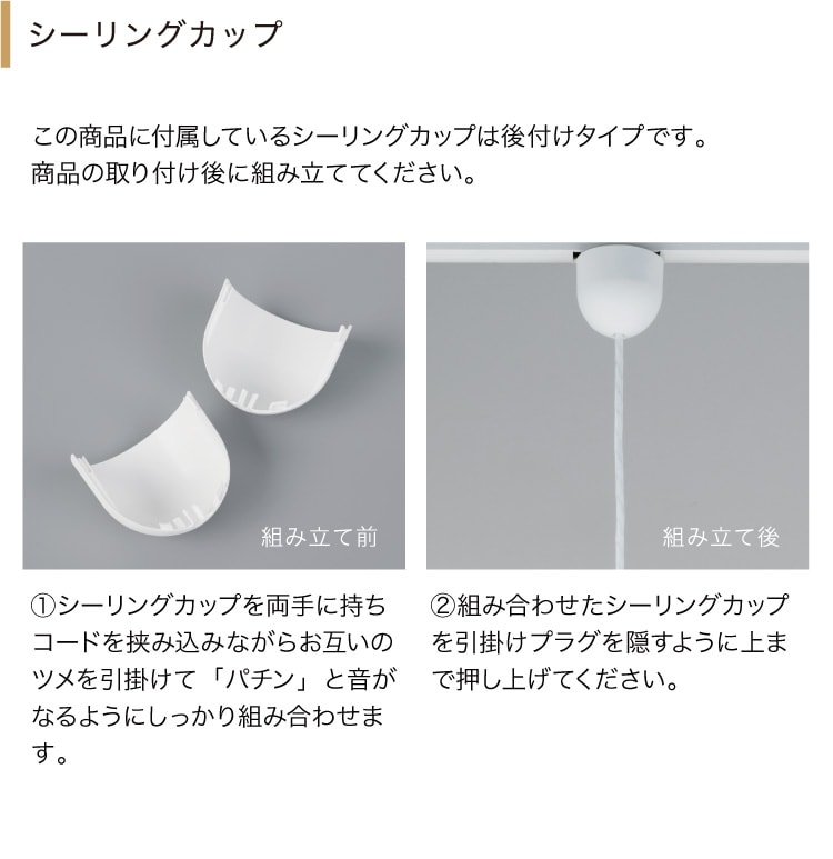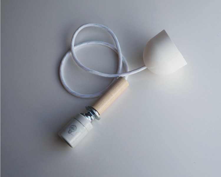 ナチュラル感のあるウッドパーツ付のソケット、プラグを隠すプラスチック製のシーリングカップが付属します。