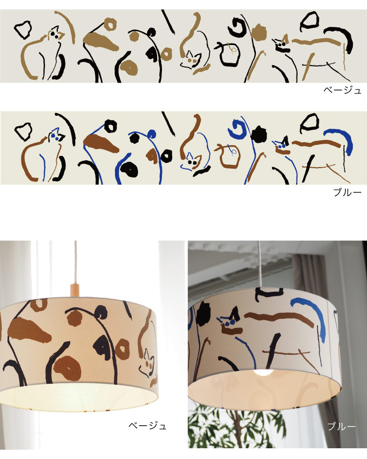オリジナル生地を作るなら、動物の柄がいいなとぼんやり考えていたところ、猫好きな人って多いなぁとふと思い、世の中にはこんなにたくさんの猫好きがいて、猫柄のアイテムも沢山あるのに猫柄の照明ってあまり見たことないなぁと思った事がきっかけで、アートな雰囲気の猫柄にしようと決め、案を練っていきました。