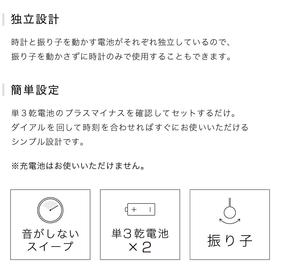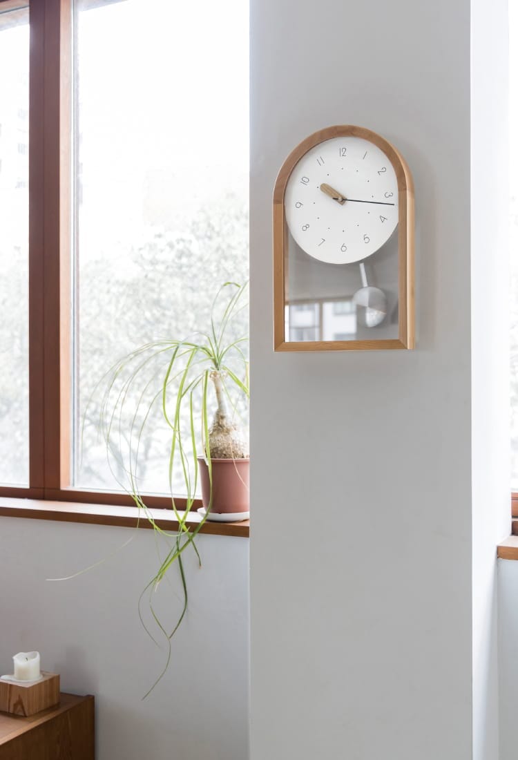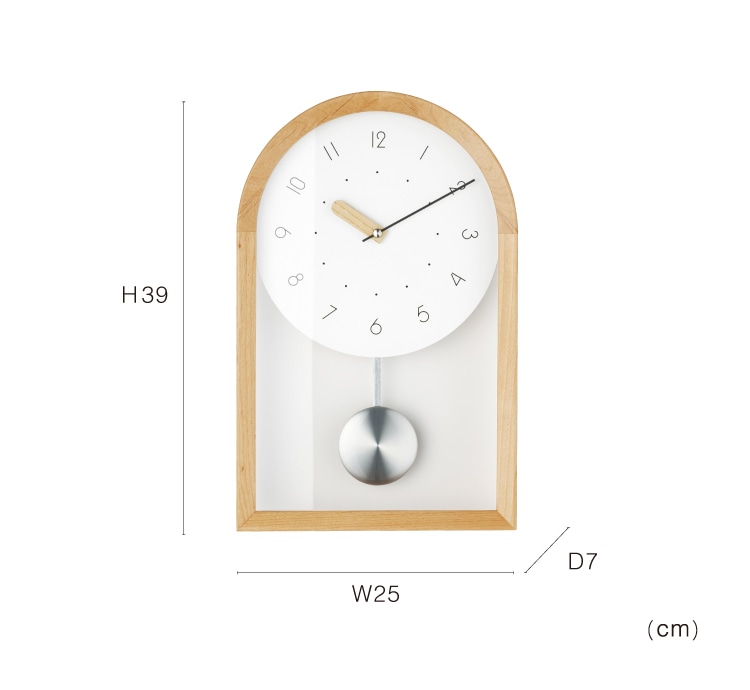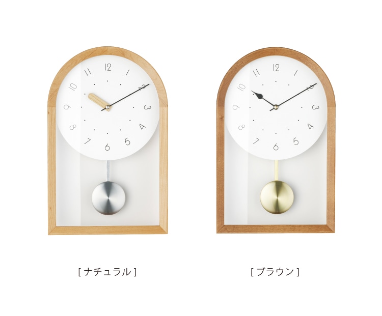小窓のようなシルエットの中で丸い振り子が左右に揺れる、置いても使える上品なデザインです。