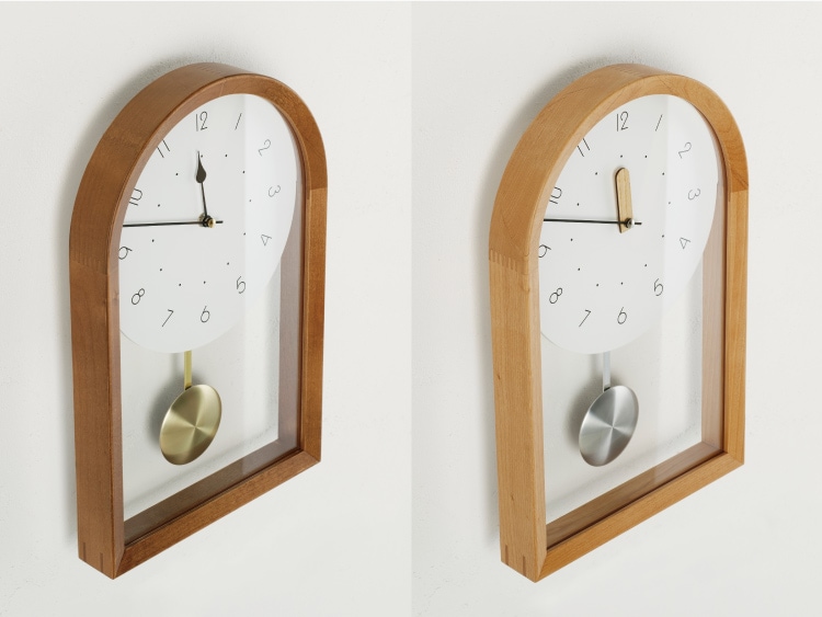 ウッドフレームに合わせて短針や振り子のカラーを変えています。