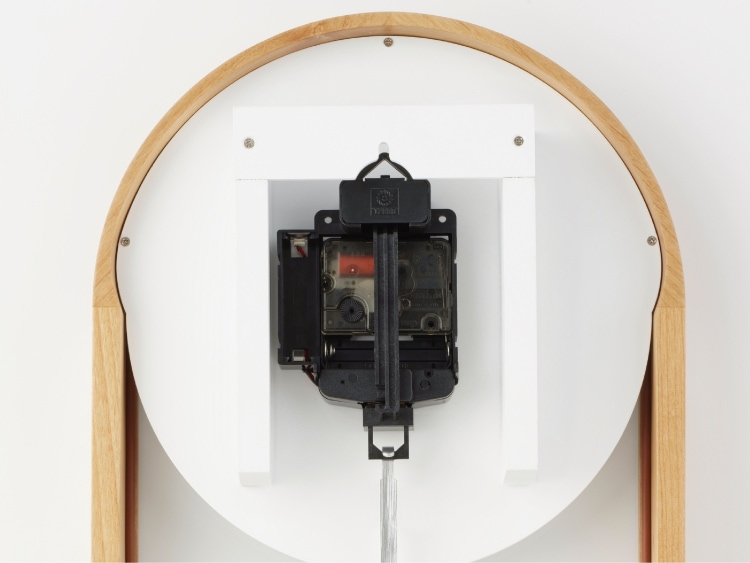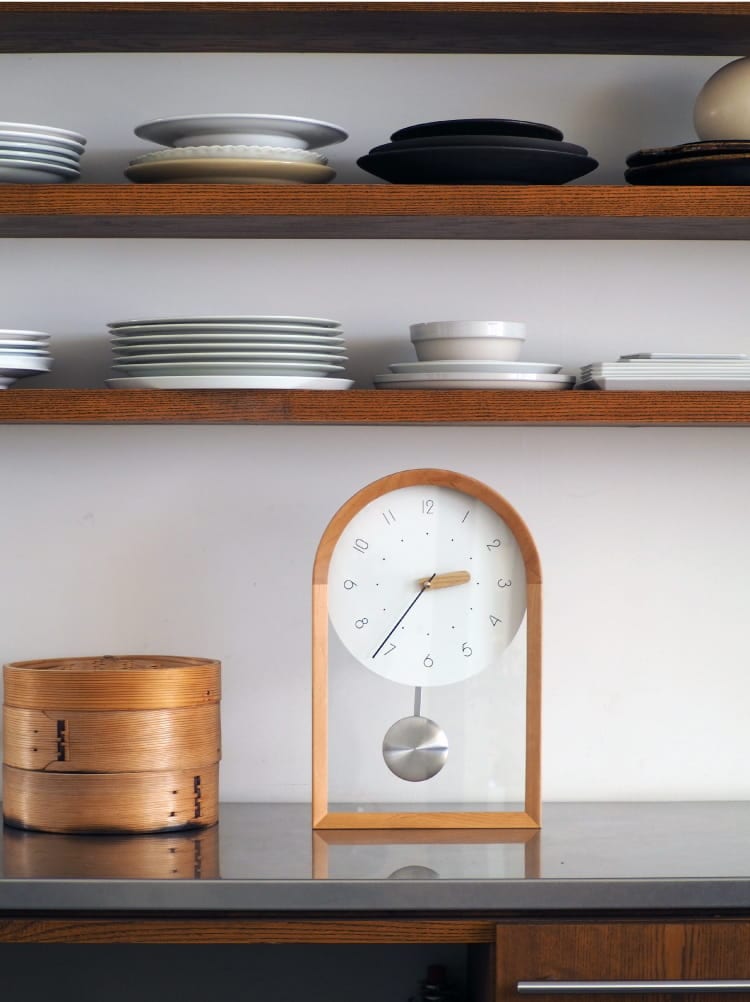 ウッドフレームとメタリックな振り子のコントラストに、向こう側が見える抜け感が加わり、軽やかな印象を与えます。