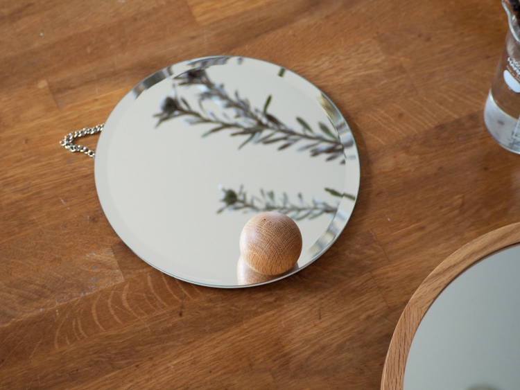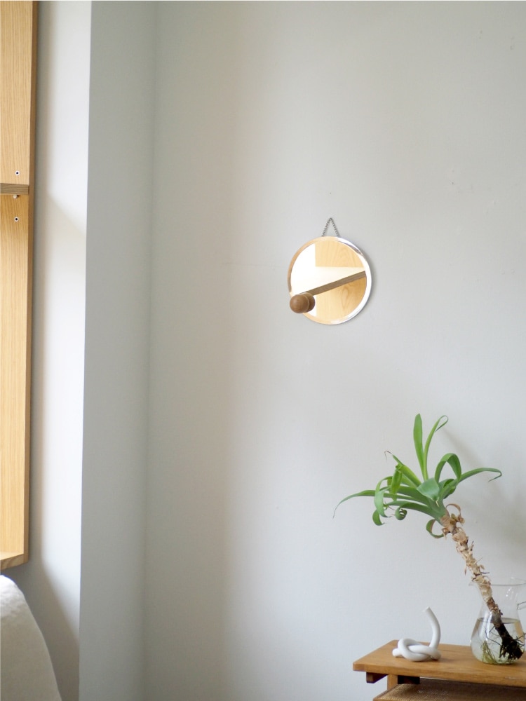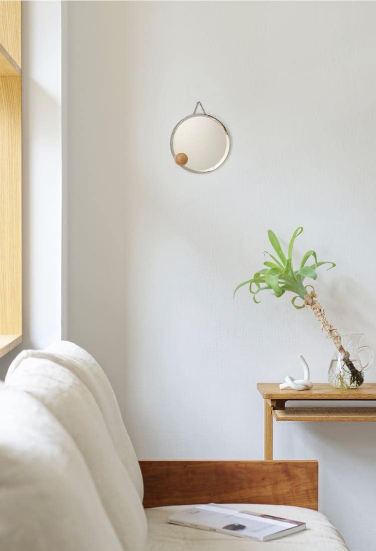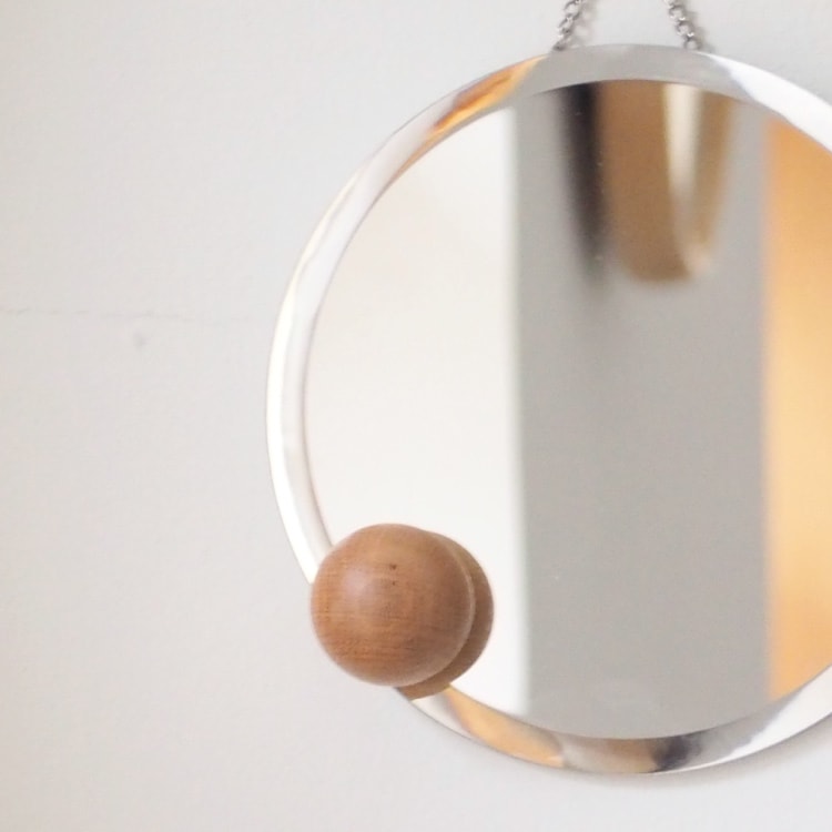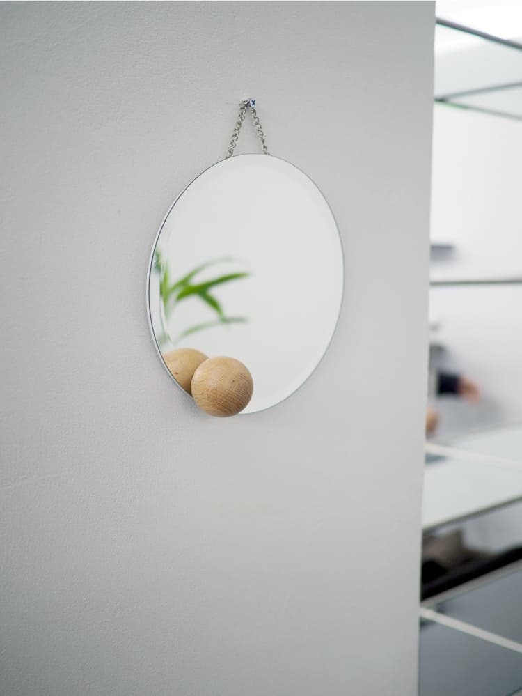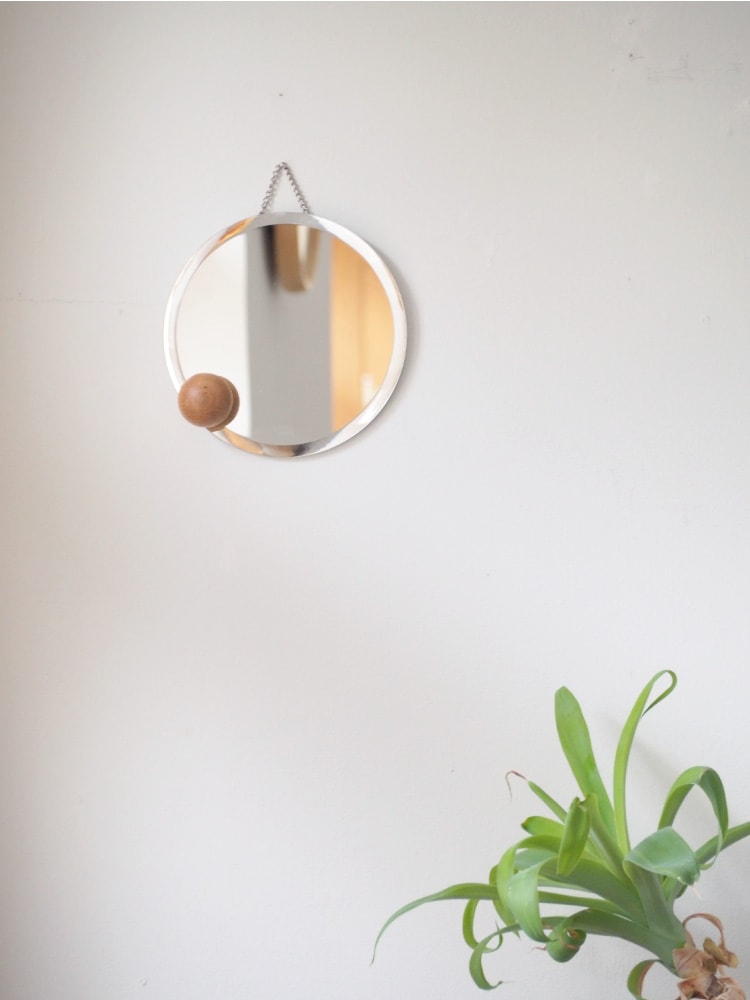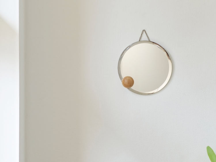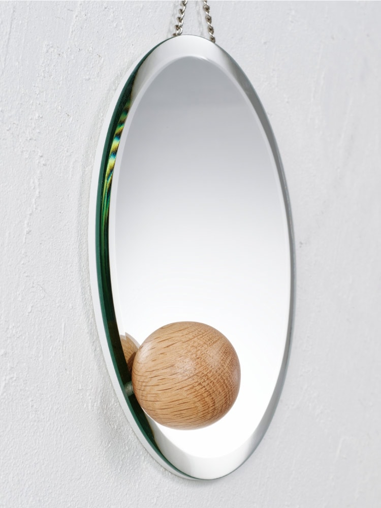 アシンメトリーにちょこんと添えたウッドボールが浮遊感を感じさせるオブジェのようなインテリアミラー。
