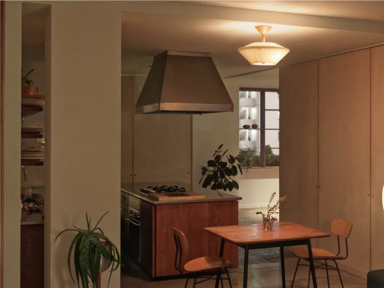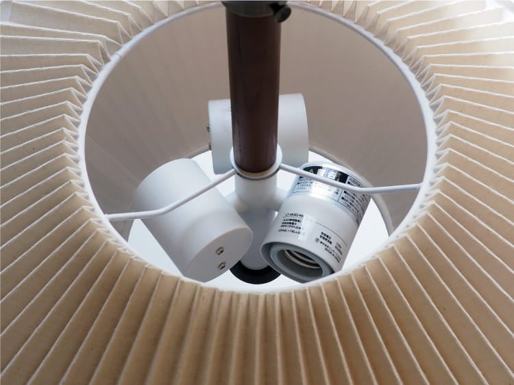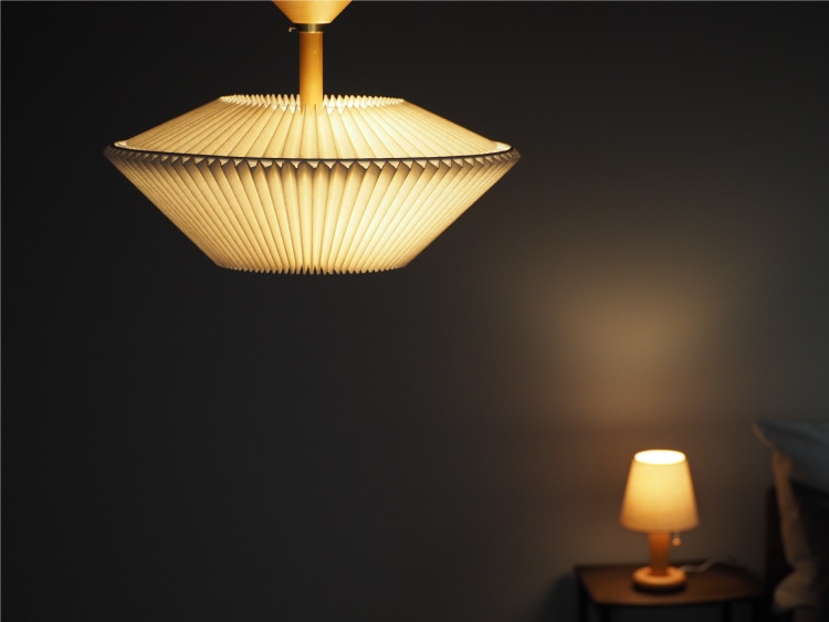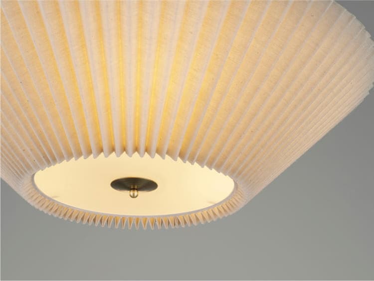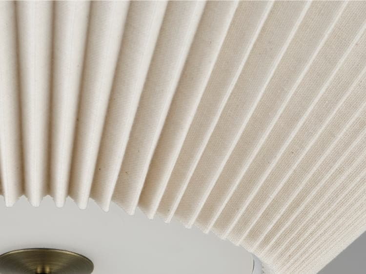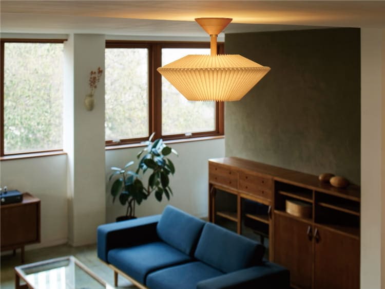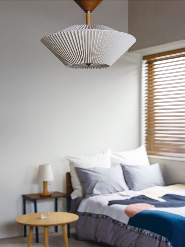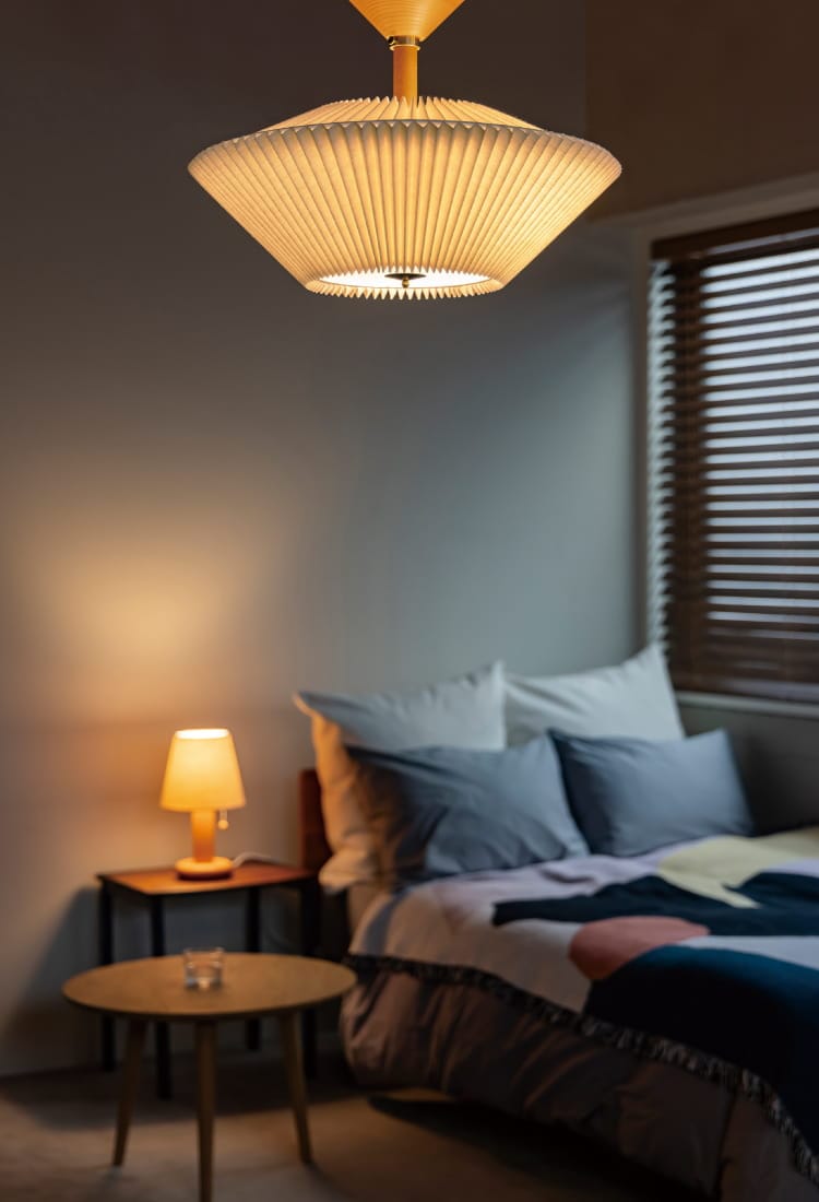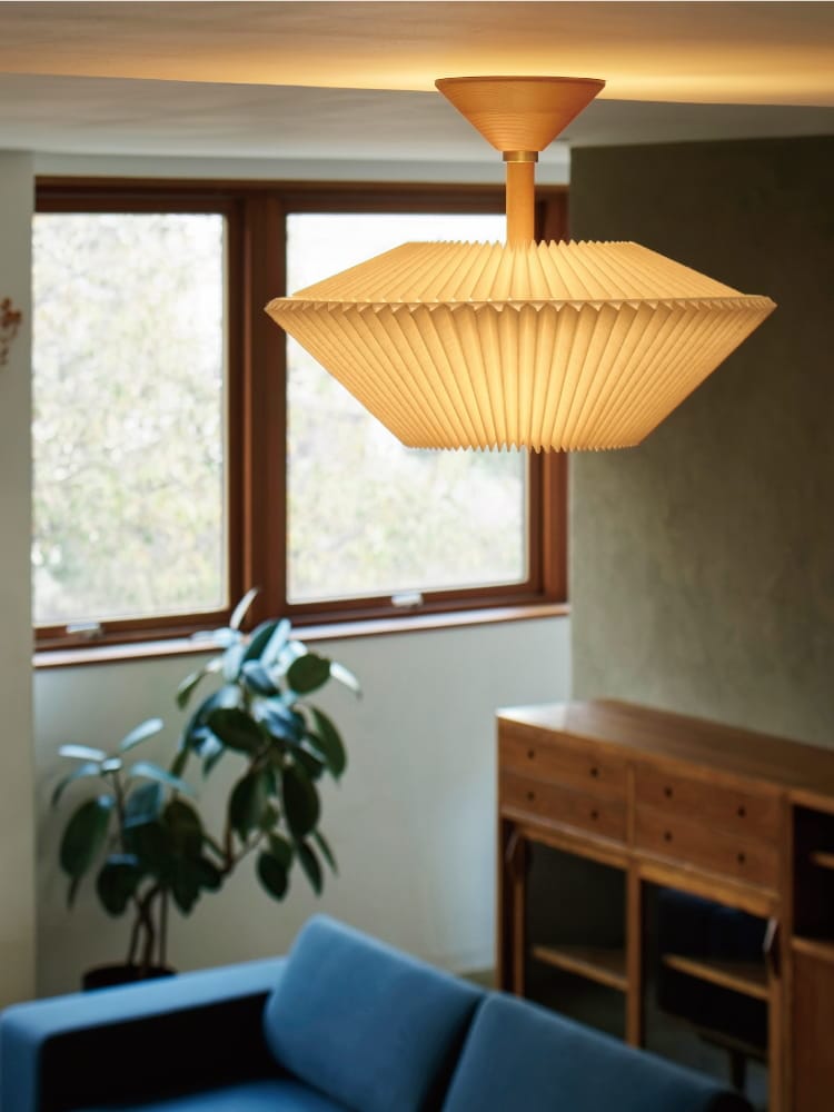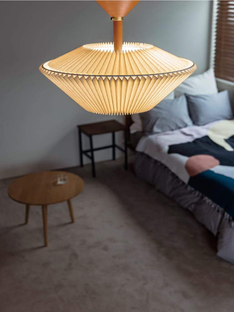 規則正しい陰影を生み出すプリーツセードを上下に重ねた、和傘にインスパイアされた工芸品のようなデザイン。