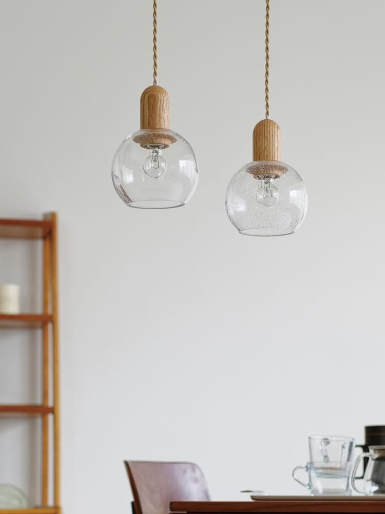 木とガラスのまるみが重なるコロンとしたフォルム。